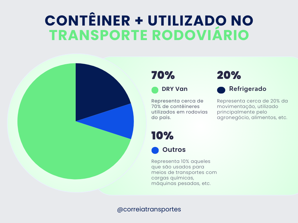 No caso, dependendo do tipo de carga, iremos usar um determinado contêiner, porém, a maioria das mercadorias quando falamos de transporte rodoviário a maioria opina pelo mesmo tipo de contêiner e isso é algo natural já que poucas empresas de pequeno porte assumem uma responsabilidade de por exemplo, transportar alimentos ou medicamentos. Não só pela logística que é mais detalhada por conta da refrigeração então precisa de um armazenamento específico, como também pela quantidade de casos de roubos desse tipo de carga. Ficando ainda mais vulnerável e com um medo de acabar perdendo recursos para a entrega de um determinado produto.